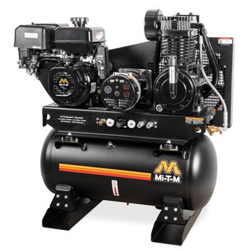 This 30-gallon unit combines an air compressor, generator and welder into one setup. Equipped with a 420cc Mi-T-M OHV engine, this powerful unit delivers 15.7 CFM at 175 PSI, up to 5000 watts of power and a duty cycle of 150V at 100%. Its rugged design and versatility make it ideal for jobsites with varying needs.
